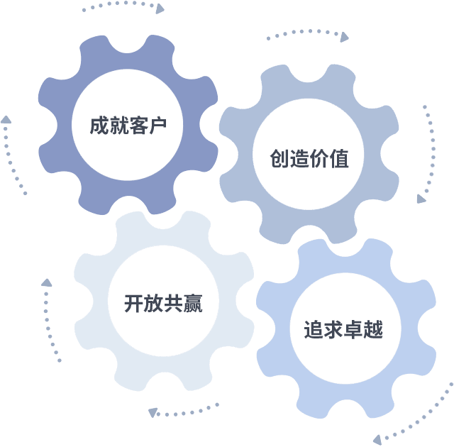 成就客户是一切决策的出发点,,,创造价值是衡量所有工作的标准,,,,追求卓越是我们做事做人的态度,,,开放共赢是我们的格局也是最终的结果。。价值观的齿轮环环相扣,,,推动着组织里的每个人不断向前。。。