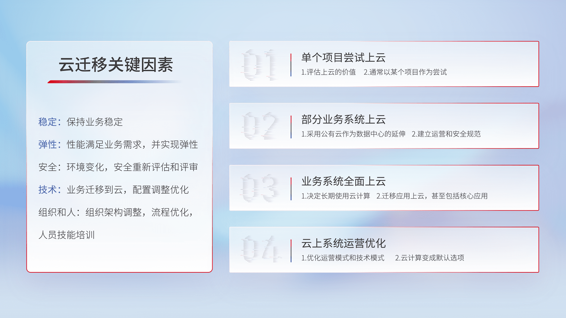 结合实际业务,,从规划设计、、、、云平台选型、、、、云原生改造、、、、数据迁移、、、、集成交付,,,,迁移全过程为客户识别最佳上云路径,,做好风险识别管理,,,,设计网络架构、、、、身份权限、、、安全审计合规、、操作审计、、日志审计、、监控告警策略、、、、多站点容灾设计等,,,,对云上基础设施进行整体规划,,,提升IT治理水平,,,,以满足弹性、、、、高可用、、、高性能的需求。。。