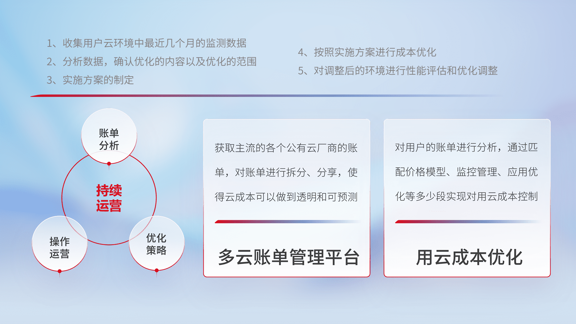 通过多云纳管,,以统一的资源数据模型把客户的云资源进行抽象和封装,,进而实现对多云资源的统一操作,,保障云资源管理的可靠性、、、稳定性与可用性。。。。量身定制化运维内容,,,配置、、、、开发运维、、、补丁管理、、、、备份、、、、监控、、认证和访问管理、、、、审计和日常巡检等,,,,保障在用云过程中的可靠度,,,稳定度以及高可用率。。。。